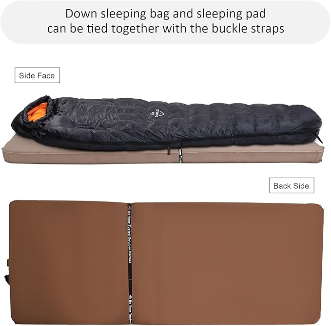 - 【Cool Innovative Design】: 1. There are two small pockets with zippers on the chest, allowing you to freely reach out to read or play with your phone. 2. Buttons have been added to the bottom and waist of the sleeping bag, so you can freely walk around while wearing the sleeping bag.3. You can wear the sleeping bag on your shoulders and fix it with the buttons of sleeping bag, making it usable as a cloak.4.The sleeping bag and a air pad can be tied together by the included buckle strap.