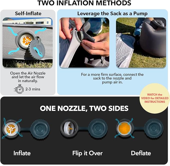 - TWO INFLATION METHODS: inflate your can air mattress effortlessly by laying out the mattress, simply twisting the valve, and let air get in. If you prefer a more firm sleeping surface, you can leverage the mattress sack, which has been equipped with a connecting nozzle that plugs into the mattress valve: plug the sack into the mattress and use the sack as a natural pump for maximum Inflation - watch the video to see how easy it is!