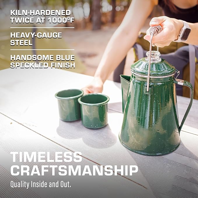 - TIMELESS CRAFTSMANSHIP: Built from heavy-gauge steel, every piece of this stovetop coffee maker is kiln-hardened twice at 1,000℉. A handsome green camping coffee pot built to last
