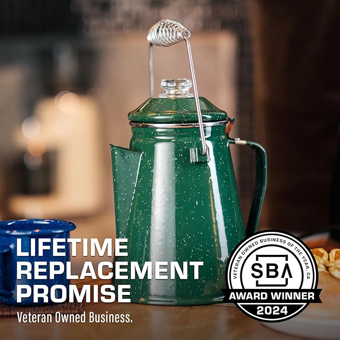 - LIFETIME REPLACEMENT PROMISE: Top materials & workmanship enable a superb promise. Shop with confidence. This is the last camping coffee pot you will ever need. US-based customer service provided by veterans