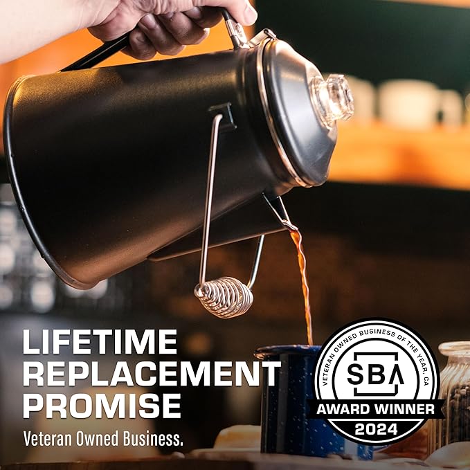 - LIFETIME REPLACEMENT PROMISE: Top materials & workmanship enable a superb promise. Shop with confidence. This is the last camping coffee pot you will ever need. US-based customer service provided by veterans