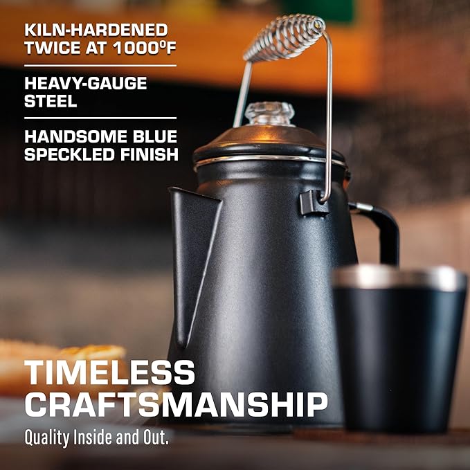 - TIMELESS CRAFTSMANSHIP: Built from heavy-gauge steel, every piece of this stovetop coffee maker is kiln-hardened twice at 1,000℉. A handsome gray camping coffee pot built to last