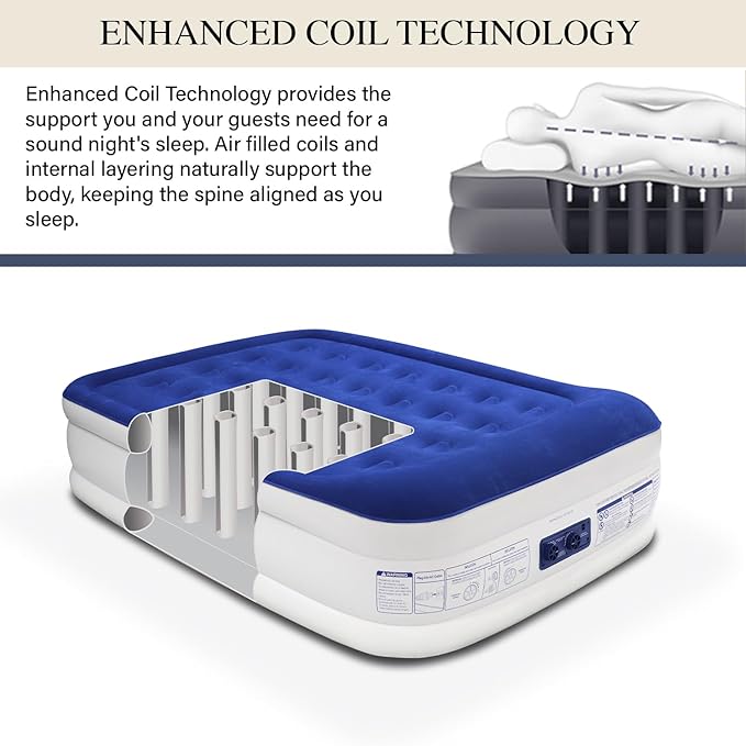 - King Koil Full Size Air Mattress Provides Luxury Comfort with Built-In Pillow & 1-Year Warranty: Experience exceptional sleep on our King Koil 20" full double high airbed. Featuring a plush, built-in pillow, luxurious pillow top, soft flocking layer, and advanced coil-beam construction, this airbed is engineered with durable, waterproof, and puncture-resistant materials to ensure a restful night’s sleep.