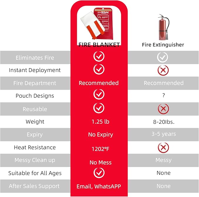 - Never Expire & Leave NO Mess: Unlike traditional extinguishers, the fire suppression blanket never expires. That means no need to be replaced. It can also extinguish small fires quickly and easily with no mess. Included: 2 PACK 39.3 X 39.3 Inches (1*1m) Fire Blanket with 2 Hooks.