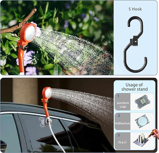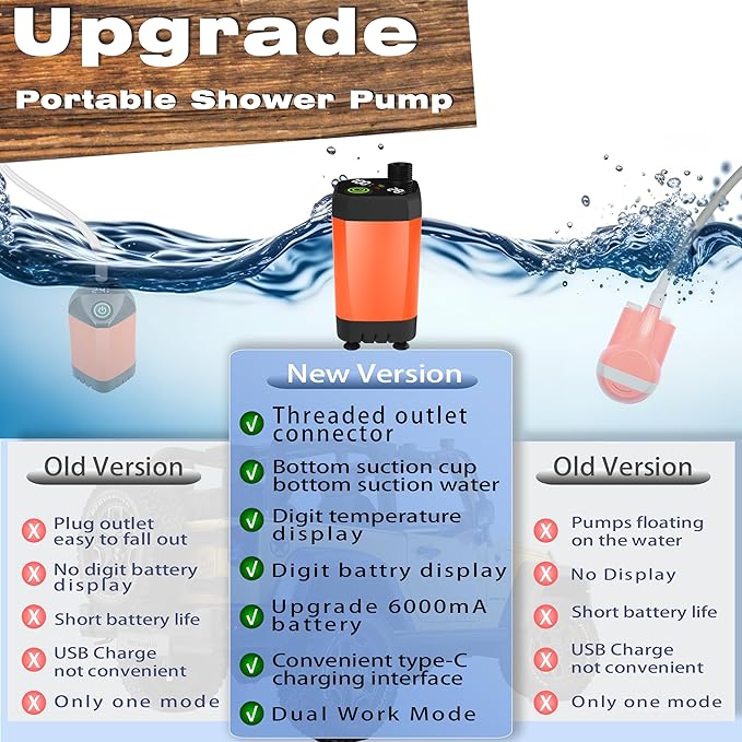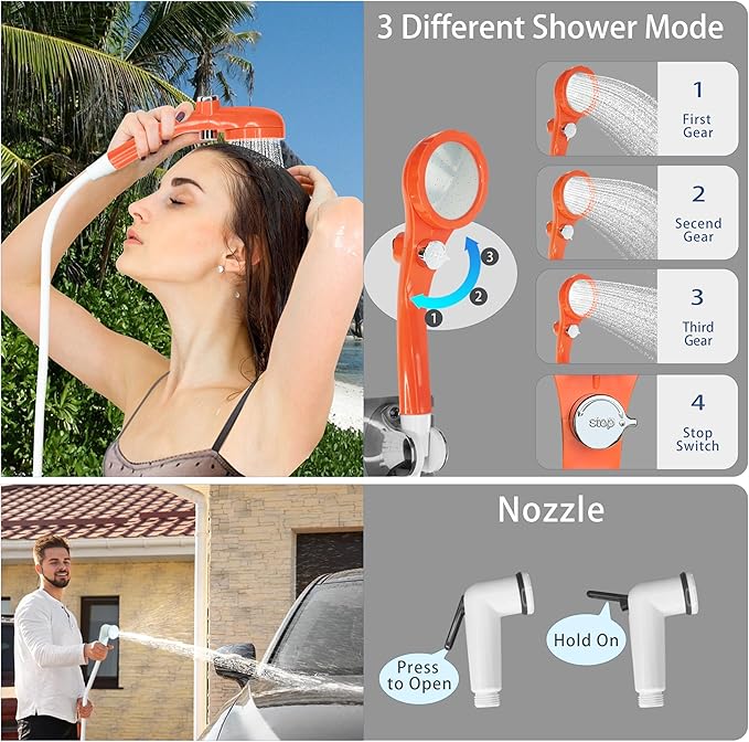 - [MULTIFUNCTIONAL DESIGN FOR VERSATILITY] Shower Pump Made Of High-Quality Materials, Ipx67 Waterproof, Protecting The Motor Safety And Able To Withstand The Harsh Requirements Of Outdoor Use. Hose Nozzle And Showerhead Bracket Adapt To Various Usage Scenarios. Whether For Showering, Washing, It'S Easy To Handle. Plus, The Portable Collapsible Water Bucket Makes Your Outdoor Life More Convenient.