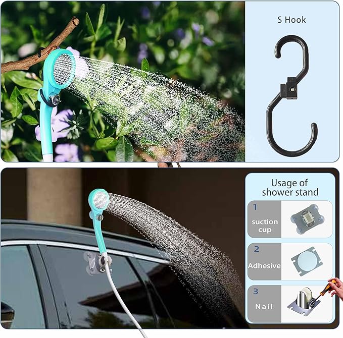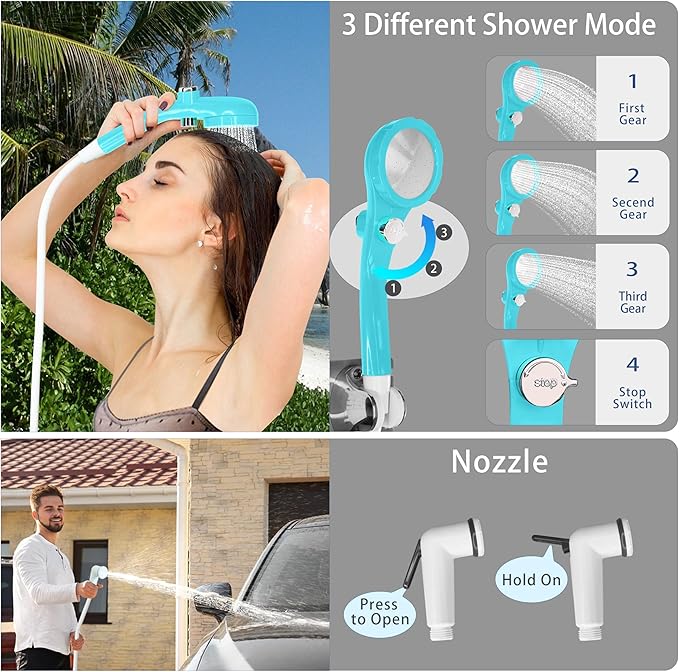 - [MULTIFUNCTIONAL DESIGN FOR VERSATILITY] Shower Pump Made Of High-Quality Materials, Ipx67 Waterproof, Protecting The Motor Safety And Able To Withstand The Harsh Requirements Of Outdoor Use. Hose Nozzle And Showerhead Bracket Adapt To Various Usage Scenarios. Whether For Showering, Washing, It'S Easy To Handle. Plus, The Portable Collapsible Water Bucket Makes Your Outdoor Life More Convenient.