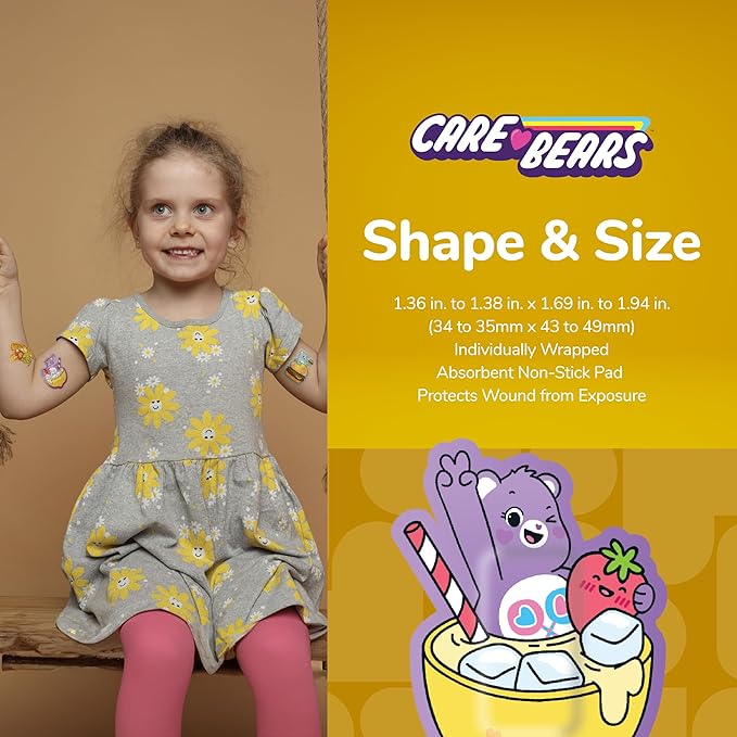 - CARE BEARS BANDAGES: This 24 piece pack of Care Bears bandages feature fun Wish Bear, Funshine Bear, Share Bear, and Cheer Bear shapes, and is great for putting a smile on kids' faces while protecting wounds such as cuts, scrapes, and burns; sticky bandages come in a cute cardboard box and are perfect for kids and adults alike, and also for school nurses and pediatric doctors