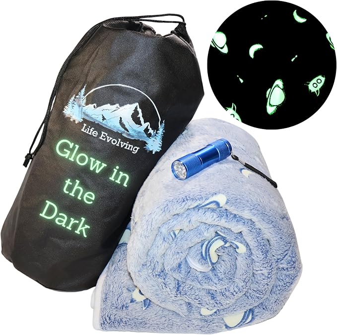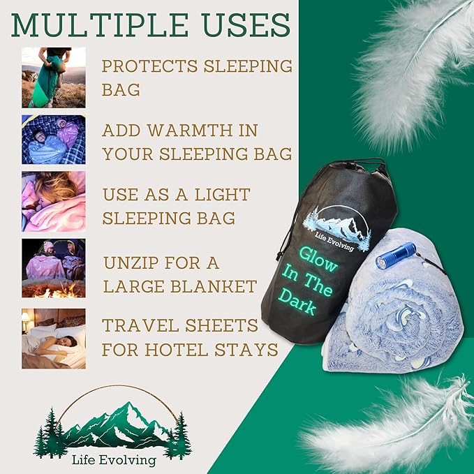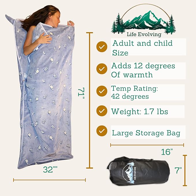 - Large Enough For Adults, Fun Enough For Everyone: The LifeEvolving 71"x 32" glow In the dark blanket sleeping-bag liner turns every night, whether under the stars, in a tent or staying in a hotel, into a celestial adventure. This 4 season sleeping bag makes a cozy travel bed for adults or anyone in the family!