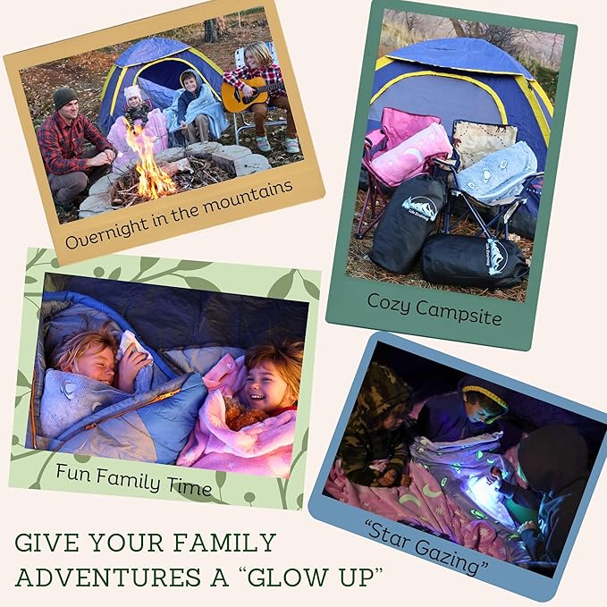 - Large Fleece Blanket: Unzip this magical travel sheet sleep sack to reveal a generous sized 70" x 62" glow in the dark blanket. When you need camping blankets for cold weather, this liner is the perfect sleeping bag blanket for adults or kids to wrap themselves in cozy warmth around the campfire after a day of thrilling adventures.