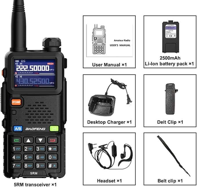 - What's in the box: Baofeng 5rm radio with antenna x 1, 2500mAh rechargeable battery x 1, Earpiece x 1, Desktop charger x 1, Belt clip x 1, Hand strap x 1, User's manual x 1.