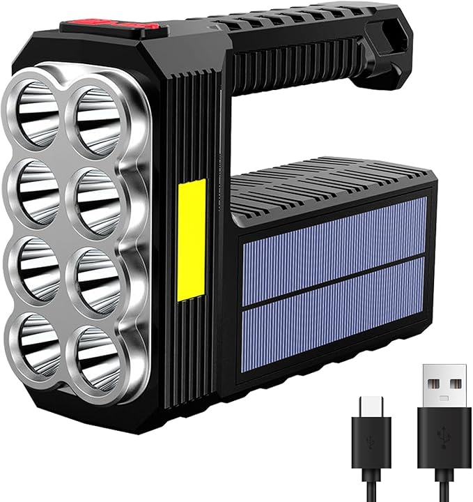 Solar Flashlight Rechargeable 8 LED Handheld with COB Sidelight, High Lumens 3 Modes Searchlight, Portable Lightweight Waterproof Spotlight for Fishing Outdoor Camping Emergencies