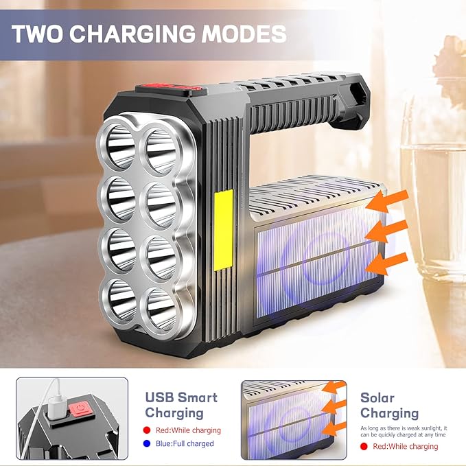 - Solar Charge & USB Charge: Our flashlight has two charging modes: Solar Charge & USB Charge. Solar Charge: Equipped with solar panels, as long as there is weak sunlight, it can be quickly charged at any time. USB Charge: There is an USB charging port on the side of the flashlight, which can be connected to a computer, car and power outlet.