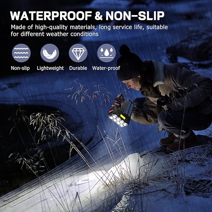 - High Brightness & Durable: New multi-function searchlight with eight high-brightness LED wicks, reaching ultra-high 1000 lumens, can provide up to 984 feet / 300 meters of strong light at night, able to illuminate the entire road or mountain. The flashlight is sturdy and durable, the battery and bulb have a long life, don't worry about damage, it is a must-have for your home and travel.