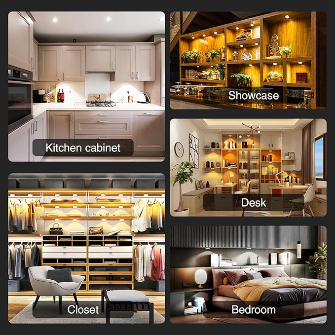 - 【3 Color Temperatures Puck lights with remote &Dimmable Tap Lights】 Our wireless LED puck lights provides 3 different color temperatures (3000K / 4500K / 6000K).MEKKLEON cabinet lights with remote control, stepless dimming by pressing +/- button to increase/decrease brightness, minimum 30LM, maximum 150LM. Easily press the K/☀ switch to choose the right amount/color of light to meet your different needs. Rechargeable under cabinet lighting saves energy and money for your family