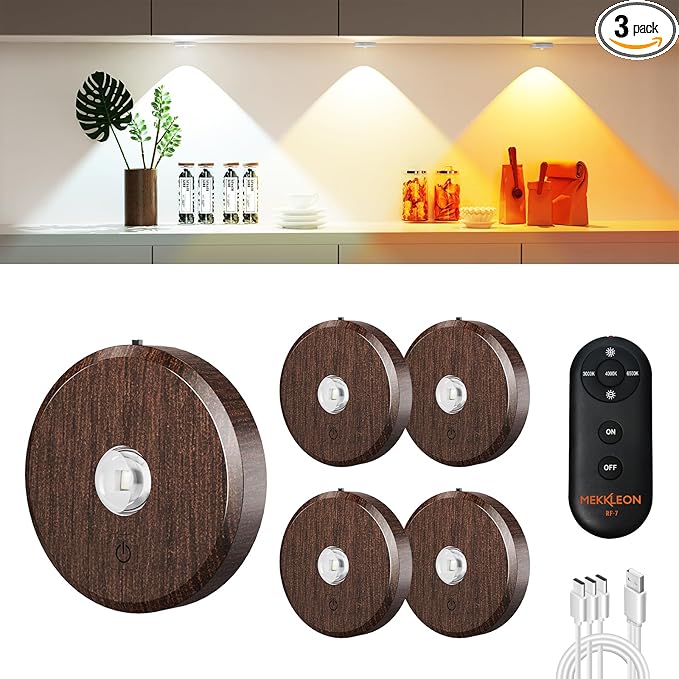 - 【3 Color Temperatures Puck lights with remote &Dimmable Tap Lights】 Our wireless LED puck lights provides 3 different color temperatures (3000K / 4500K / 6000K).MEKKLEON cabinet lights with remote control, stepless dimming by pressing +/- button to increase/decrease brightness, minimum 30LM, maximum 150LM. Easily press the K/☀ switch to choose the right amount/color of light to meet your different needs. Rechargeable under cabinet lighting saves energy and money for your family