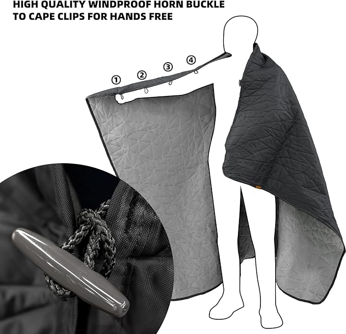 - EASY CARRY & STORAGE :80"x58"(2.5lbs), The wearable foldable travel blanket is large enough to wrap 2 people and seat 3-6 people. Comes with a portable storage backpack, secret zipper storage bag and poncho horn buckle.