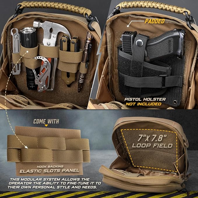 - VERSATILE SECTION ORGANIZATION: Molle Admin Pouch's main compartment features a large loop field(7"L x 7.8"H/17.8*20cm), allowing you to customize your gears to your needs with elastic webbing insert panel. A Nylon pocket via Hook-N-Loop strap closure, a mesh pocket with surface elastic band design for organizing EDC gears while carrying your iPad Pro, and flap barriers at the two sides to prevent items from falling out.