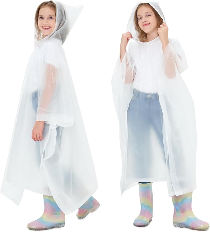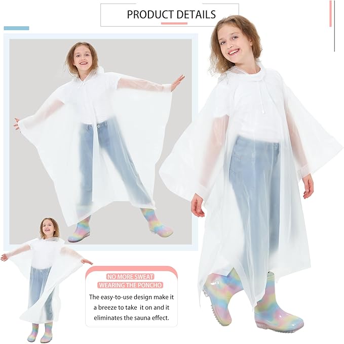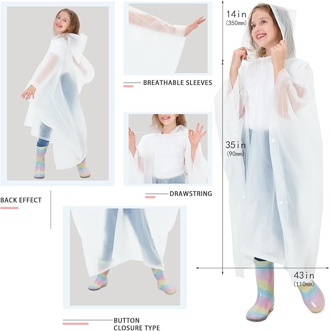 - ☔【PERFECT FIT & COOL COMFORT】Our lightweight ponchos offer a perfect fit for almost all children, accommodating both bare wearers and those carrying schoolbags. Outwear children rain coats feature a loose-fitting design that allows for air flow through the open bottom and side button sleeves, ensuring breathability and comfort. The unique design allows for airflow, keeping you cool and comfortable even on hot summer days.