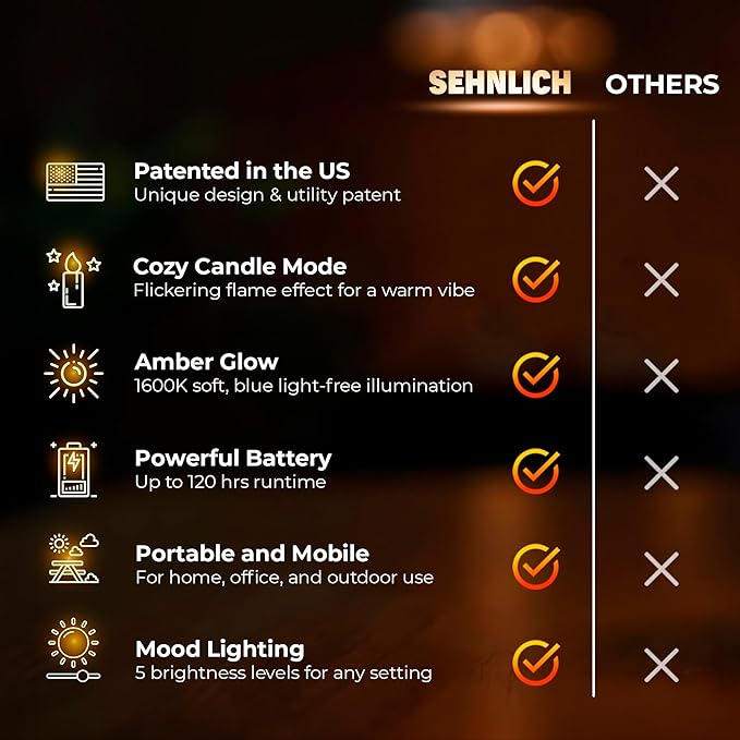 - SET YOUR MOOD FOR RELAXATION: Emitting a warm amber glow and realistic flame-like flicker, this electric lamp creates an elegant candlelight experience without the mess or risk associated with traditional candles. Ideal for bedside or night stand use, it offers a warm, comfortable 1600K color temperature with no blue light or flickering. Choose from five brightness levels to create the perfect atmosphere in any environment.