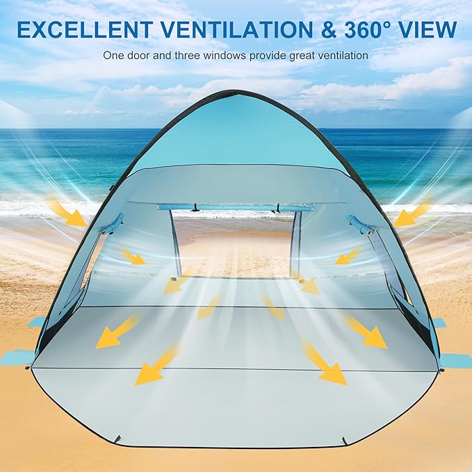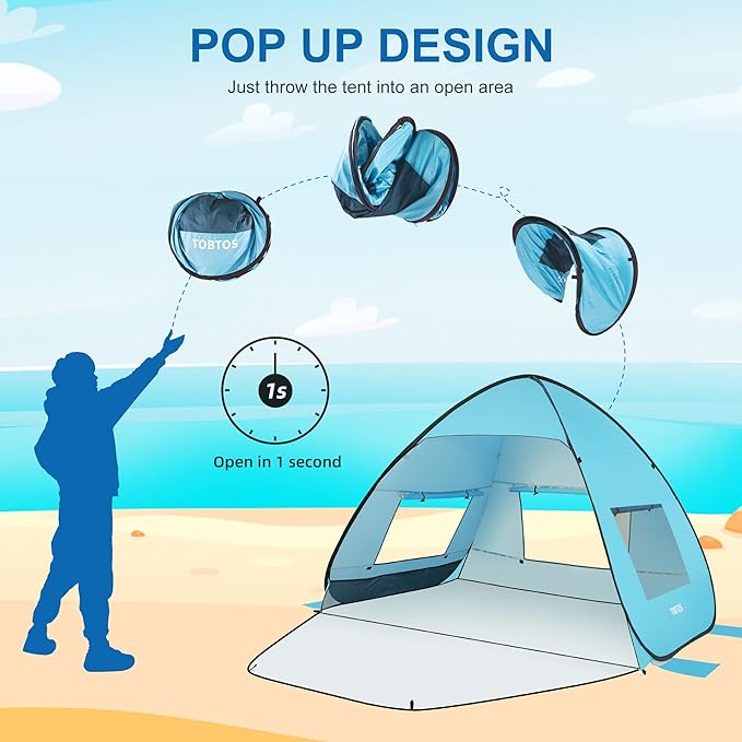 - No Assembly Required: Our pop up sun shelter has an automatic pop-up design, it will pop up in 1 second. It is also easy to fold up and put into a carry bag, making it a great companion for your fun time at the beach