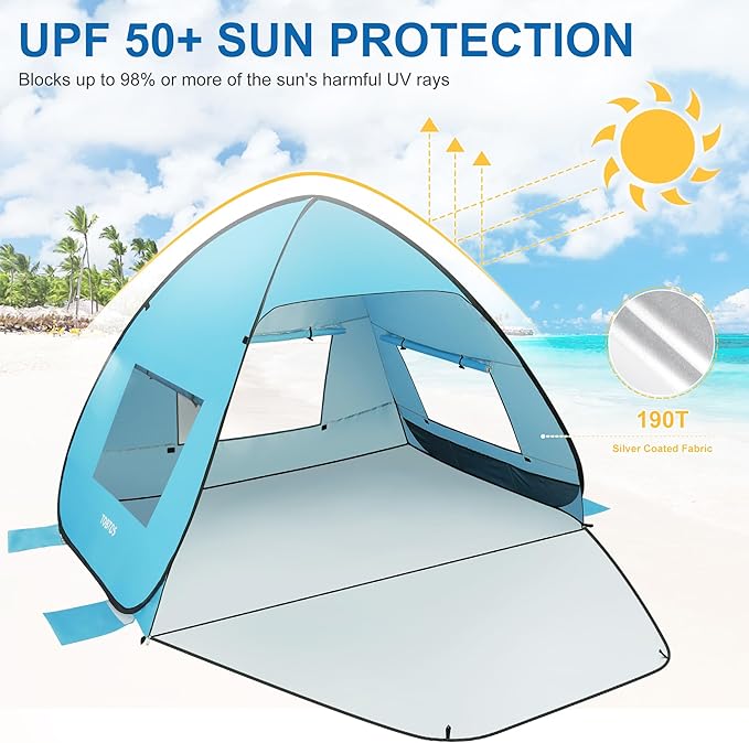 TOBTOS UPF 50+ Pop Up Beach Tent, Easy Set Up Beach Umbrella, Sun Shelter for 2-3 People UV Protection Portable Sunshade, Baby Canopy Cabana, Lightweight with Carry Bag