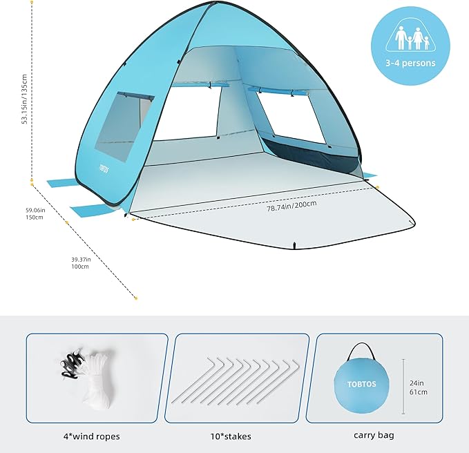 - Large Space: The pop up beach tent open size is 78"L x 59"W x 53"H with a 39" front porch, provides spacious interior space for activities and can comfortably accommodate 3-4 people. It folds to 24 x 24 x 1.6 inches and fits in a carry bag, weighing only 4.85 lbs