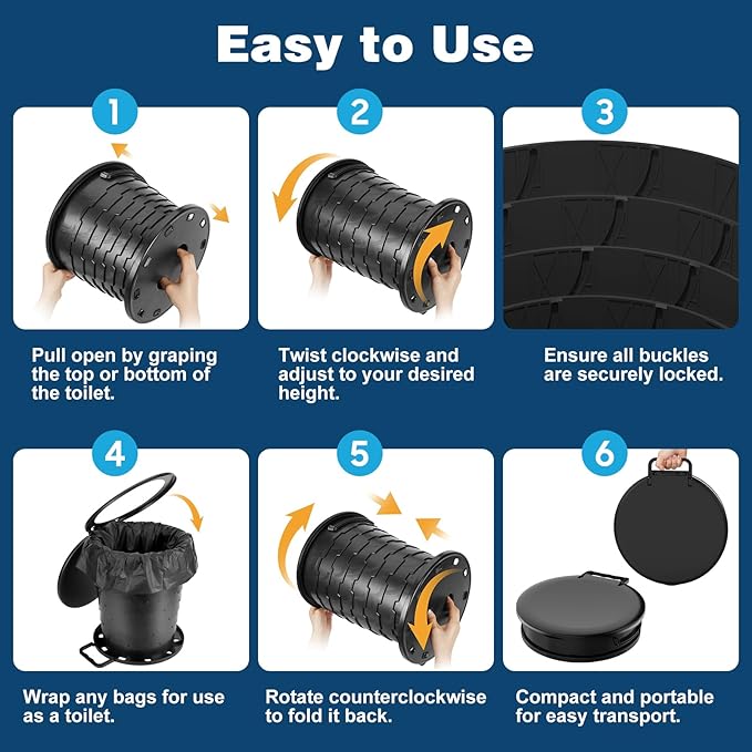 - 【Portable and Easy to Use】The portable toilet for adult is effortlessly unfolded with a simple pull and twist clockwise for instant use. Twisting counterclockwise collapses it into a compact dick for easy carrying and storage. Two handles on the lid and base enable you to effortless carry or move the toilet whether it’s fold or unfold, making it highly portable and convenient for on-the-go use.