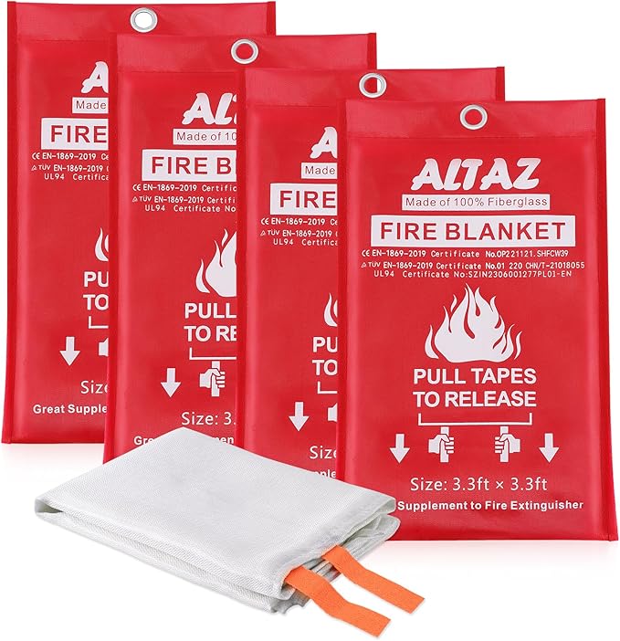 - 🔥【KEEP YOUR FAMILY SAFE】Safeguard your home and kitchen with ALTAZ upgraded emergency fire blankets. Designed as an emergency-prepared home safety device for peace of mind. You can put it on your body to escape from the fire scene. Gift Package: 4 Pack, blanket size is 39.4×39.4 Inches. Perfect as a great gift to your friends and family.