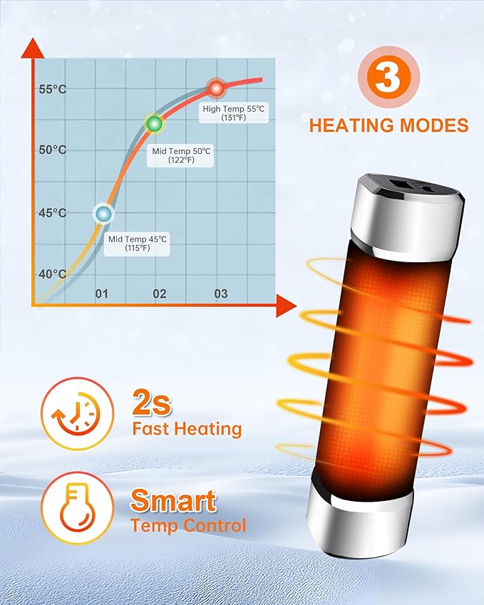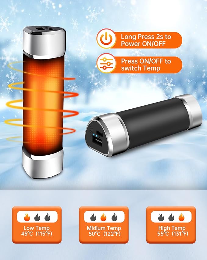 - Rapid Heating with Customizable Warmth: Experience instant, safe heating that takes only 2 seconds to warm up. Choose from three adjustable temperature settings, reaching up to 131℉ and providing up to 12 hours of cozy warmth. Select low temperature (113℉/45℃) for 5-6 hours of use, medium temperature (122℉/50℃) for 3-4 hours, or high temperature (131℉/55℃) for 2.5-3.5 hours of comforting heat.