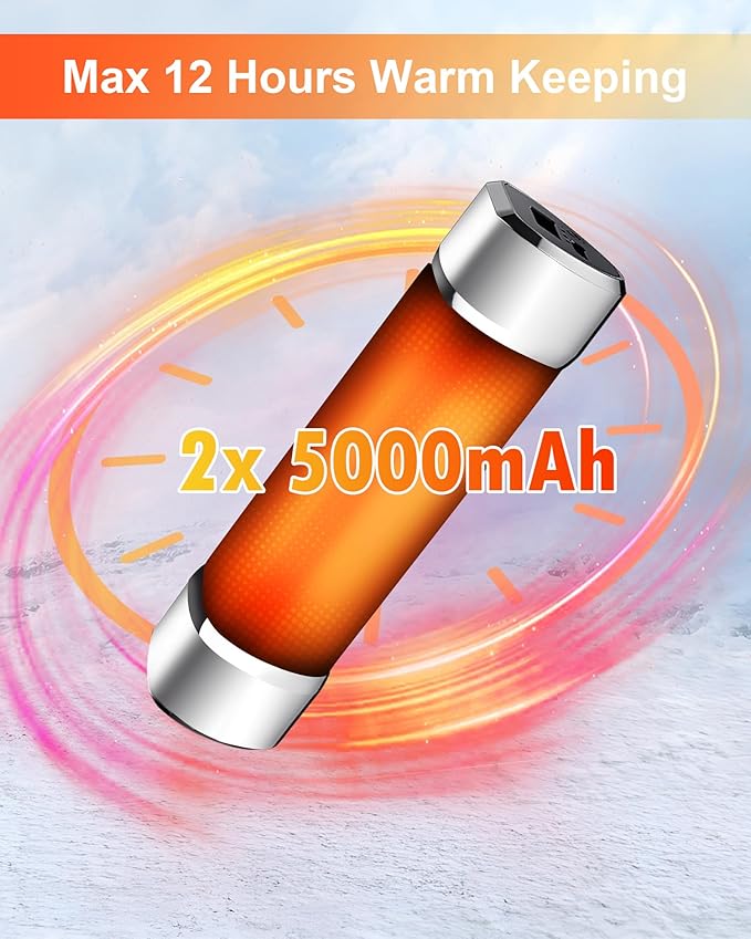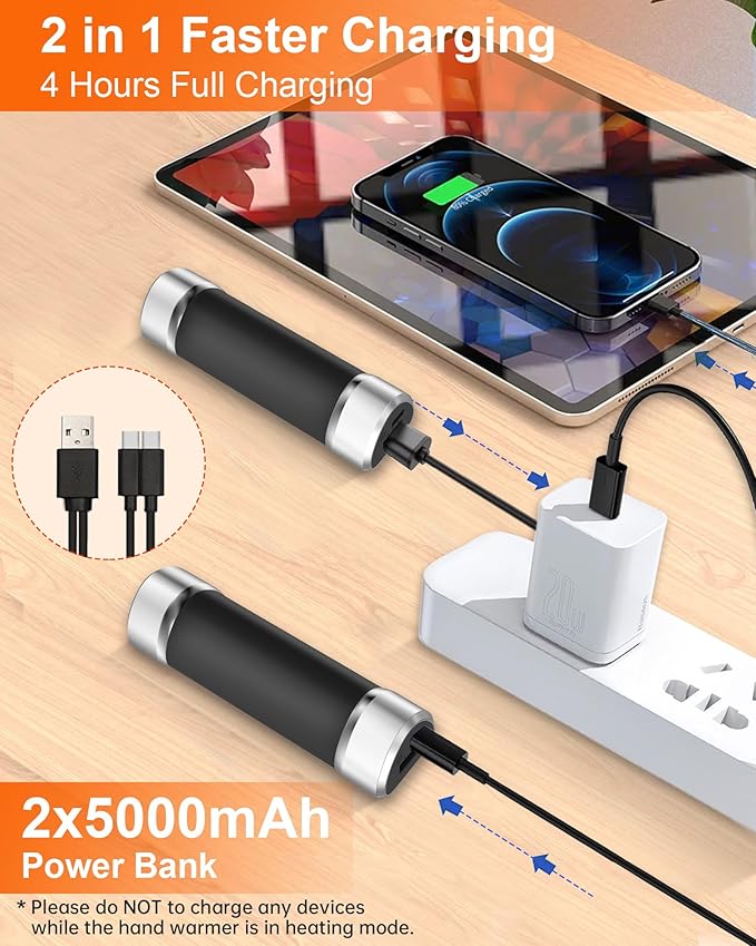 - Versatile 2-in-1 Hand Warmer and Power Bank: Each hand warmer is equipped with a built-in 5000mAh Li-ion battery, is also a practical power bank. It fully charges in just 3.5 hours and can recharge your mobile phone with a USB Type-C charging cable (output 5V/2A). Please note that it's essential NOT to charge any devices while the hand warmer is in heating mode to ensure safety.