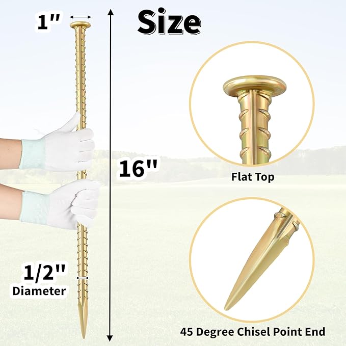 - 【RIBBED & YELLOW GALVANIZED】These rebar stakes are made of malleable steel material. Yellow galvanized to help avoid rust. Ribbed ground anchors are solid, secure firmly and no bend.