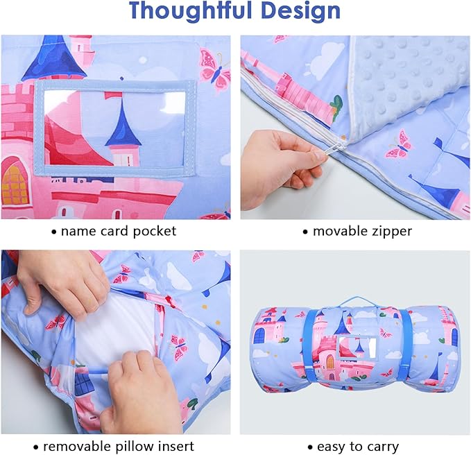 - User-Friendly Design:Our kids nap mat is a perfect portable choice for parents and children.The mat comes with a transparent name tag and portable bands for easy storage.Your little kids can operate by themself easily. It's practical for not only home but also daycare, preschool, and outdoor activities.