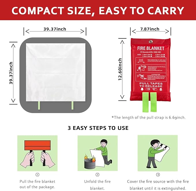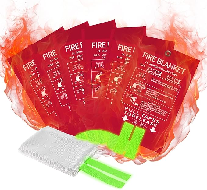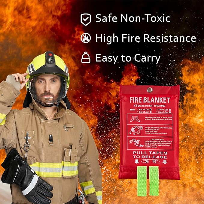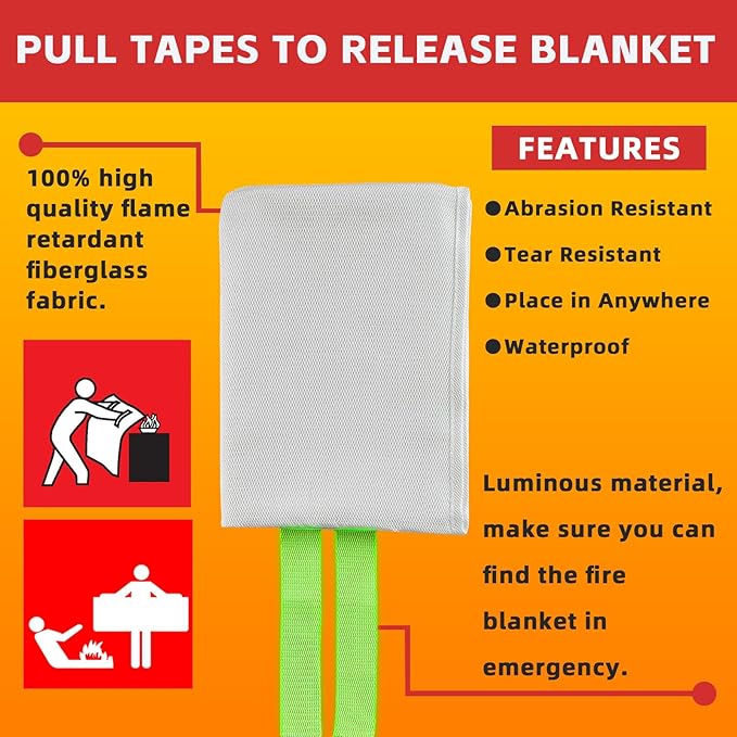 - EMERGENCY FIRE BLANKETS FOR HOME AND KITCHEN SAFETY: Fire emergency blankets are made of two layers of intricately woven glass fiber fabric and an inner layer that's made of fire-retardant film. Fire blankets work very effectively by cutting off the supply of oxygen (which the fire needs to burn) and smothering the fire. Fiberglass fire blanket for people protection while camping or cooking in kitchen, home, grill, smoker, boat, or car.