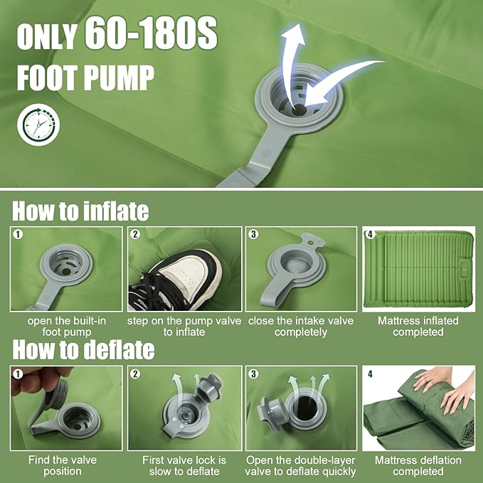 - Easy to Inflate and Deflate: Sleeping pad for camping 2 person has a built-in foot pump that can be fully re-inflated with foot pressure in just 3 minutes,children can operate the pad too. No mouth blowing,no extra pump. The thickened membrane ensures that our backpacking sleeping pad is effectively punctured and moisture-resistant. NOTE:the inflation time depends on the speed of your foot pressing