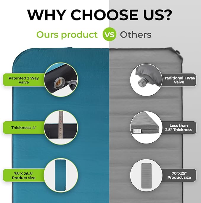 - Superior Support & Comfort: Our self-inflating sleeping pad utilizes 3D wall technology to eliminating any feeling of suspension. Unlike many camping sleeping mats with insufficient width, our 78"x26.8" car air mattress is wider and longer, the foam sleeping pad providing ample space for you to fully relax and unwind after a long day of camping