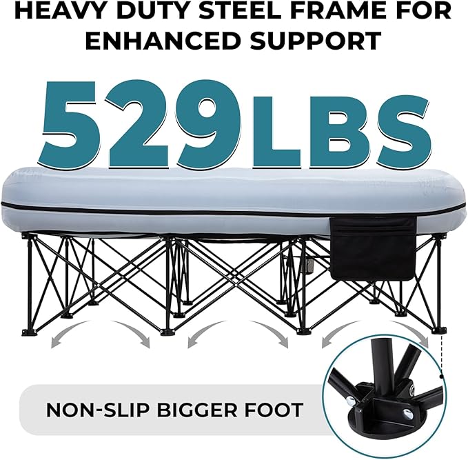 - 【Stability & Heavy-Duty Support】: Built to hold up to 529 lbs, this queen cot features a unique cross-triangle frame and 16-leg support system for unmatched stability and durability. Made with anti-corrosion coated steel and anti-slip feet for all-terrain confidence