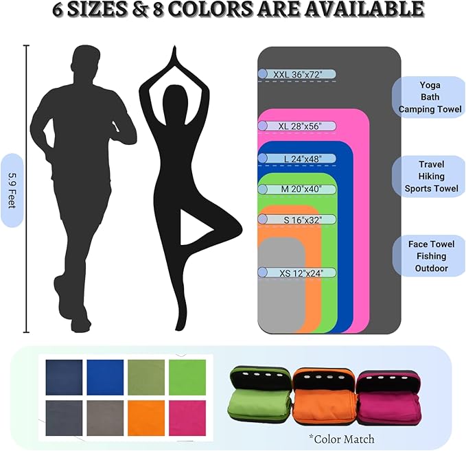 - 【Satisfy Multipurpose Usage】This microfiber camping towel comes in 8 colors and 6 sizes(XS S M L XL XXL) to meet your various needs. It can be used not only outdoors, but also for daily life. Whether swimming, surfing, fishing, camping, travelling, gym, yoga, golf or running, the towel can provide you with a full range of comfortable experiences. In addition, it's also a sweet & utility gift for sports and travel lovers.