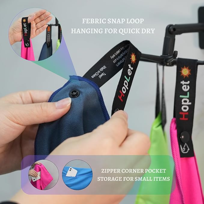 - 【Premium Microfiber Towel】The microfiber camping towel is designed with 100% microfiber, our skilled team of quality controllers ensures that each towel meets our stringent quality standards. The edge-trimmed microfiber towel is more durable and not easy to tread off. The snap loop with button can be hung up for drying anytime and anywhere. Zipper corner bag of the microfiber sport towel (M L XL XXL) can help you store small items such as mobile phones
