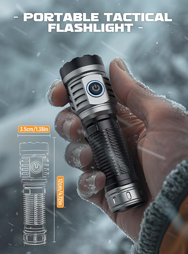 - 【1500Lumens】Equipped with an upgraded LED chip, this LED flashlight delivers a high brightness output of up to 1500lumens. It boasts an impressive irradiation distance ranging from 1800 feet to 3800 feet. With its powerful beam, it is approximately 10 times brighter than regular flashlight. It’s size is 4.72*1.38in and weight is 5.78oz.