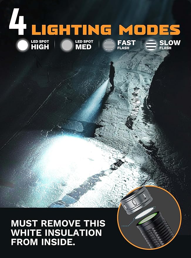 - 【4 Lighting Modes】This small flashlight features 4 lighting modes including LED SPOT HIGH LIGHT, LED SPOT MED LIGHT, FAST FLASH LIGHT, and SLOW FLASH LIGHT, allowing you to choose the appropriate mode based on your needs.