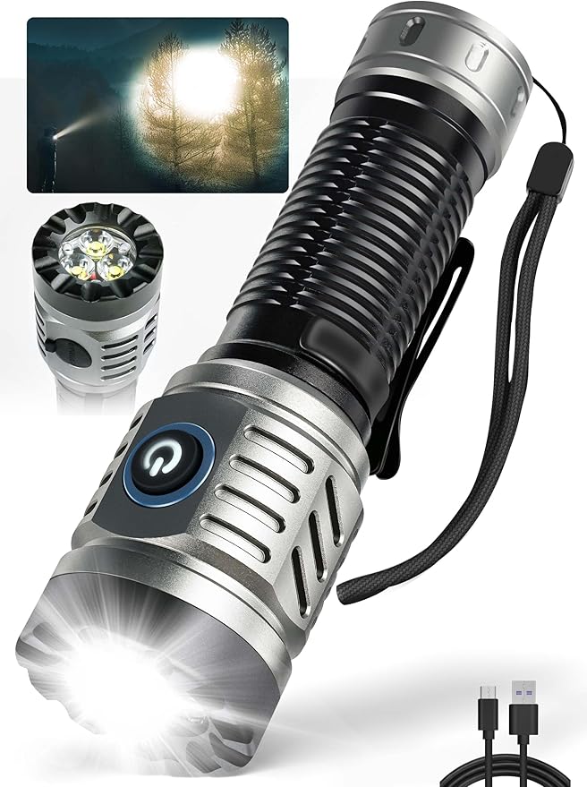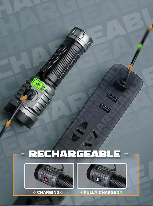 - 【USB/C Charging】This rechargeable flashlight features an exclusive USB port for fast charging. The fast charging port ensures your flashlight can be fully powered up in just 3 hours! Whether you are indoors or outdoors, on the go or at work, getting ready for an adventure or simply looking to stay safe.