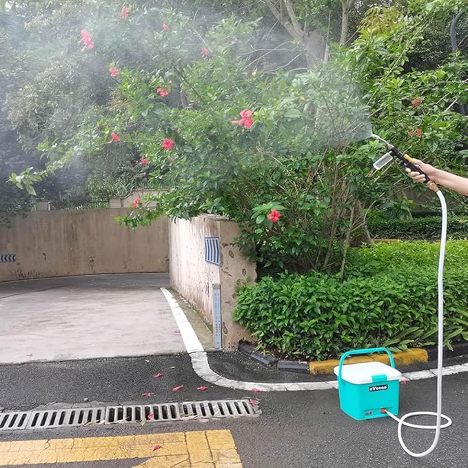 - Features - Powerful booster system(power: 90 Watts; flow:6L/Min; pressue:03-0.8MPa). The large-capacity built-in lithium battery can provide a full charge of 40-45 minutes work (30 consecutive minutes). The water use rate is as high as 99%. You can add more water at any time. Spraying water pressure is not not limited by water level changes and water addition during use. Equipped with copper connectors for quick installation and extended service life.