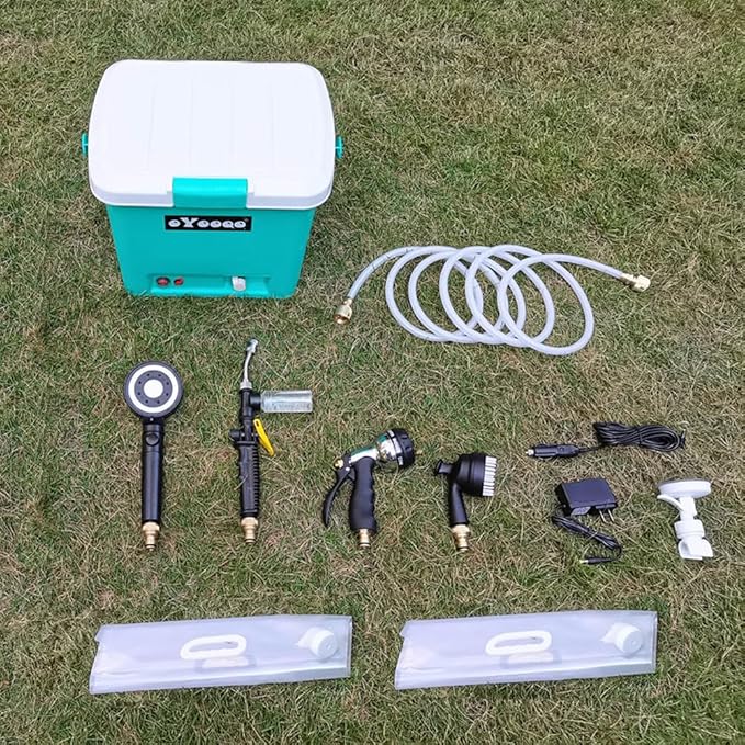 - Configuration-Battery-powered outdoor water shower; 12-volt car lighter port-powered camping shower; 12-volt battery- operated water pump; pure copper brushless motor; 13-foot shower hose with water-conserving showerhead & high-pressure car wash gun & garden sprinkler with 7 outlet modes; two portable water bags; 5-gallon water tank with wet and dry separation. The device is powered by a built-in lithium battery or a 12V car charger. The lithium battery is charged by a 100 -240V household power