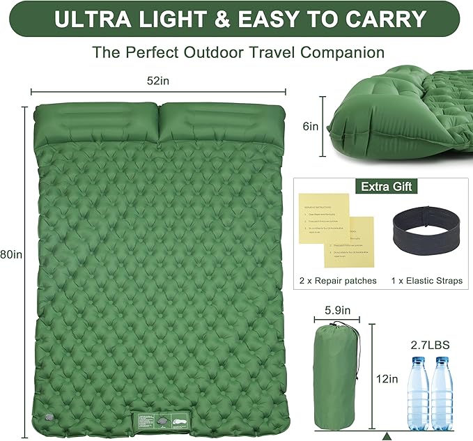 - 【Only Two Water Bottles Weigh】Experience the pinnacle of convenience with our ultra-light sleeping pad for camping, tipping the scales at a mere 2.7lbs - the equivalent of carrying just two water bottles. Designed for backpackers and travelers who prioritize mobility without compromising on comfort, this camping bed is your perfect travel companion.