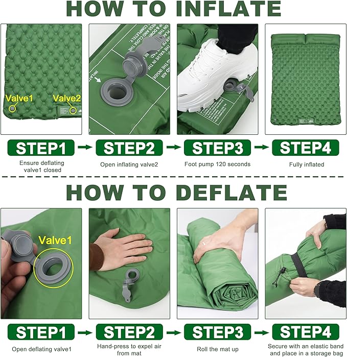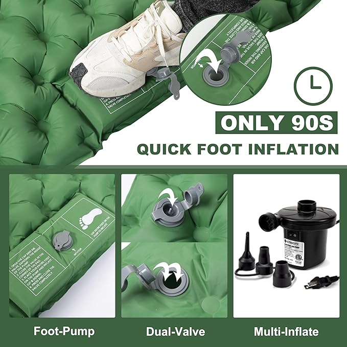 - 【90s Inflation/1s Deflation】With a 90-second foot-pumping feature, our self inflating sleeping pad inflates swiftly and conveniently. A unique valve design allows for rapid deflation in just 1 second, ensuring a hassle-free packing experience. Of course, the exact inflation time depends on the method of inflation and the speed of your foot stepping down, but if you use an inflatable electric pump, it will take only 15 seconds to complete the inflation of this camping sleeping pad.