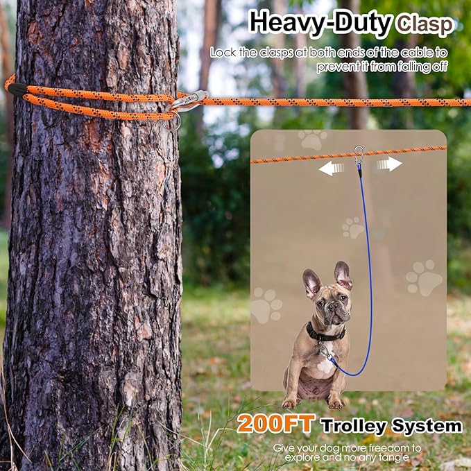- EASY TO INSTALL AND TEARDOWN: Quickly installed by one person in just 5 minutes! Simply wrap the two ends of dog run cable between two trees or other anchor points, and then snap on the carabiner clips. To increases your pet's free roaming range, provide great mobility for your pets, while ensuring that they are in a safe sight range.