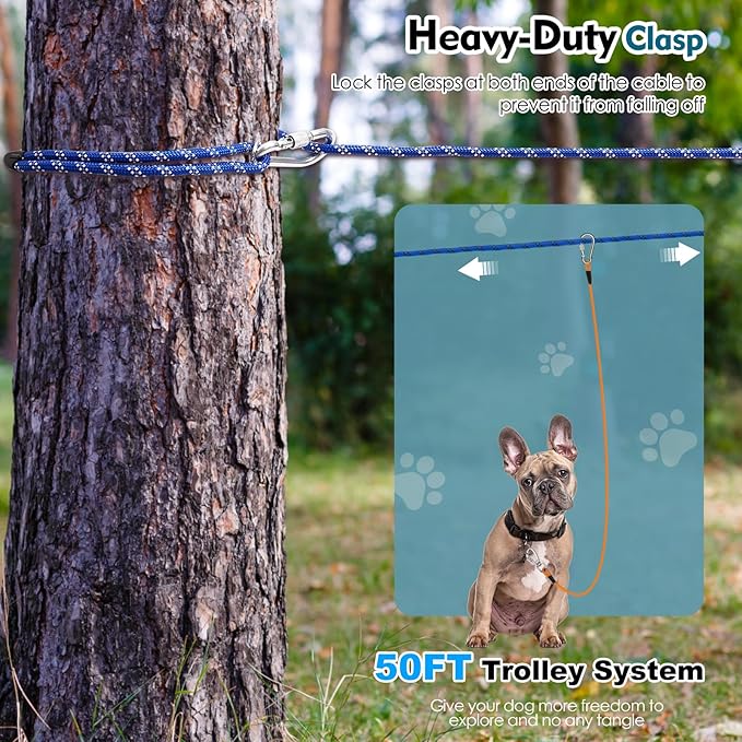 - EASY TO INSTALL AND TEARDOWN: Quickly installed by one person in just 5 minutes! Simply wrap the two ends of dog run cable between two trees or other anchor points, and then snap on the carabiner clips. To increases your pet's free roaming range, provide great mobility for your pets, while ensuring that they are in a safe sight range.
