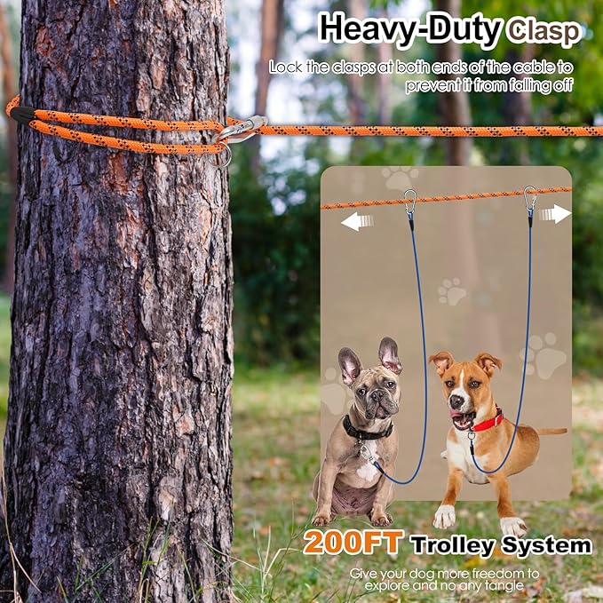 - Easy Setup & A Complete Set: Quickly installed by one person in just 5 minutes! Simply wrap the two ends of 200 feet dog run cable between two trees, and then snap on the carabiner clips. Our dog trolley system for large dogs is equipped with a 50ft long dog leash and 2 stainless steel clips, a carrying bag is also included which is convenient to carry and store.