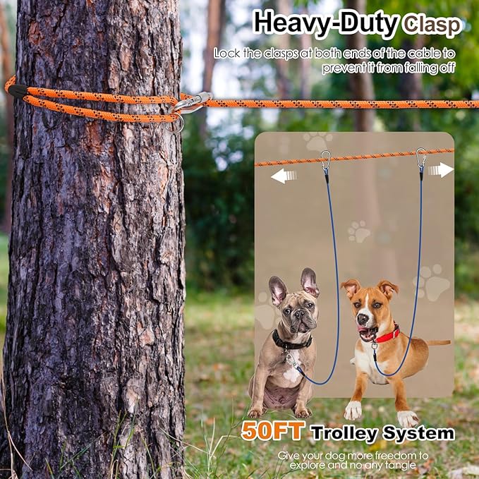 - Easy Setup & A Complete Set: Quickly installed by one person in just 5 minutes! Simply wrap the two ends of 50 feet dog run cable between two trees, and then snap on the carabiner clips. Our dog trolley system for large dogs is equipped with a 50ft long dog leash and 2 stainless steel clips, a carrying bag is also included which is convenient to carry and store.