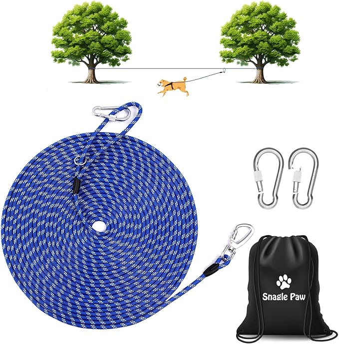 - 3 IN 1 DOG RUNNER PACKAGED INCLUDED: Snagle Paw 3 in 1 Dog runner for yard come with a storage bag: 1x200ft dog cable,1x360 degree free-rotating clip, 3xcarabiner,1 x user manual. (Tips: Short lead cable do not included). If you have any questions, please feel free to contact us, we will solve it for you as soon as possible.